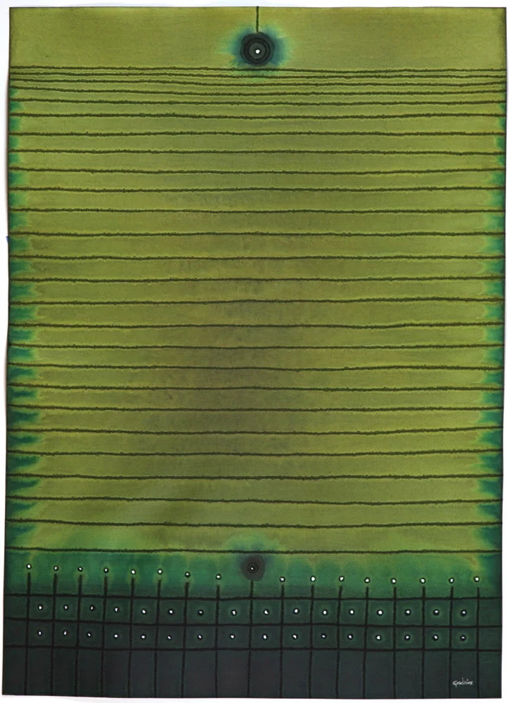 Settling in Copenhagen, Mr. Qadri participated in more than forty one-man shows, in Bombay, Vienna, Brussels, London, Oslo, Stockholm, Montreal, Toronto, Los Angeles and New York. He distilled Tantric symbolism into his own abstract, modernist language using broad areas of open color, capturing the northern landscape and sky of his Scandinavian surroundings. Although he began his career in the 1950s painting in oil on canvas, he worked on paper from the 1970s onward. He covered the surface of the paper with structural effects by soaking it in liquid and carving it in several stages while applying inks and dyes. In the process, the paper was transformed from a flat, two-dimensional surface into a three-dimensional medium. The repetition of careful incisions on the paper was an integral part of his meditation—and, in fact, his process evolved out of his desire for an effortless method of creation in tune with his yogic practice.